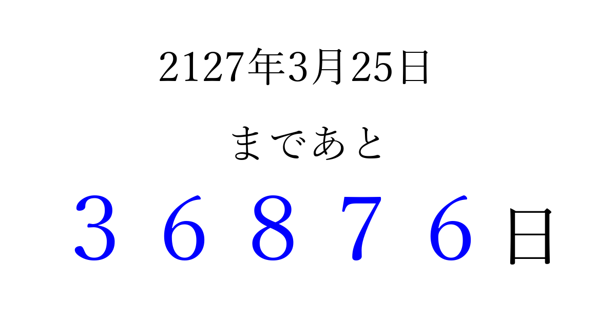 2127年3月25日(火)まで あと 99999 日です 追加すると、トップページからすぐ選べるようになります ※2026/04/07現在の結果です。 最新の状態に更新する ↓シェアして、タイムライン上にカウントダウンを表示しよう!↓ 📤 この結果を共有する Tweet シェア Threads Bluesky 別の日付でカウントダウン 2127年3月のカレンダー このページをブックマークに追加すると、いつでもカウントダウンを確認できます。 (PC: Ctrl+D / Mac: ⌘+D) hitome-notes.comでは以下のページも運営しています。 指定日と期間から日付を計算 | ガチャ確率計算・シミュレーション | プライバシー・ポリシー 運営者:Avocado