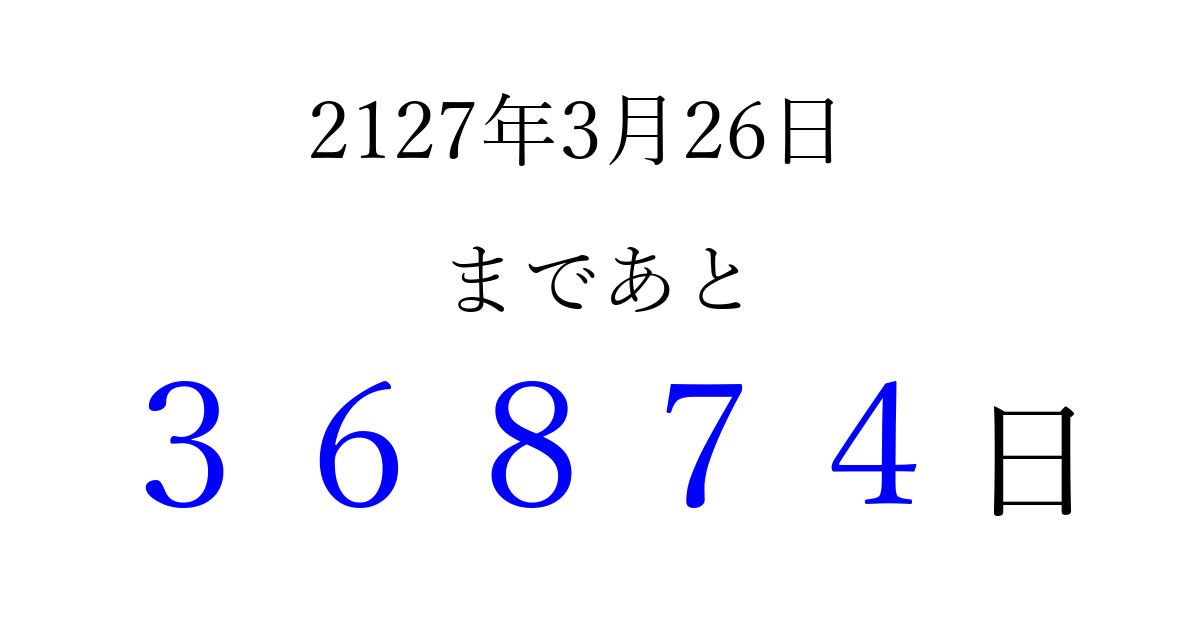 2127年3月26日(水)まで あと 99999 日です 追加すると、トップページからすぐ選べるようになります ※2026/04/10現在の結果です。 最新の状態に更新する ↓シェアして、タイムライン上にカウントダウンを表示しよう!↓ 📤 この結果を共有する Tweet シェア Threads Bluesky 別の日付でカウントダウン 2127年3月のカレンダー このページをブックマークに追加すると、いつでもカウントダウンを確認できます。 (PC: Ctrl+D / Mac: ⌘+D) hitome-notes.comでは以下のページも運営しています。 指定日と期間から日付を計算 | ガチャ確率計算・シミュレーション | プライバシー・ポリシー 運営者:Avocado