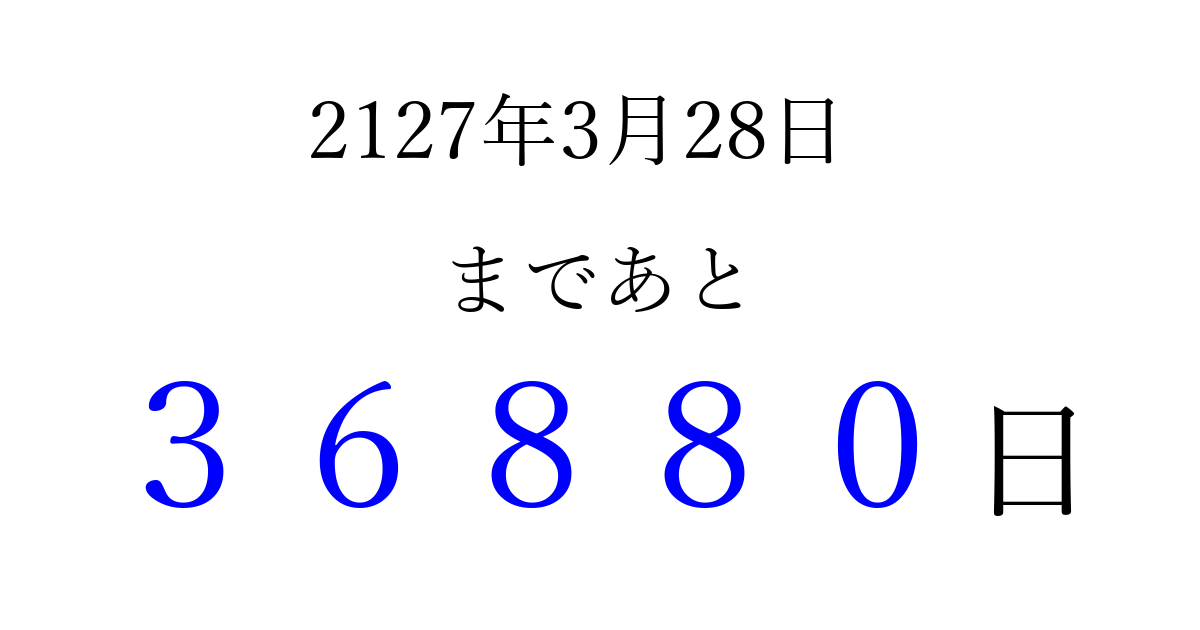 2127年3月28日(金)まで あと 99999 日です 追加すると、トップページからすぐ選べるようになります ※2026/04/06現在の結果です。 最新の状態に更新する ↓シェアして、タイムライン上にカウントダウンを表示しよう!↓ 📤 この結果を共有する Tweet シェア Threads Bluesky 別の日付でカウントダウン 2127年3月のカレンダー このページをブックマークに追加すると、いつでもカウントダウンを確認できます。 (PC: Ctrl+D / Mac: ⌘+D) hitome-notes.comでは以下のページも運営しています。 指定日と期間から日付を計算 | ガチャ確率計算・シミュレーション | プライバシー・ポリシー 運営者:Avocado