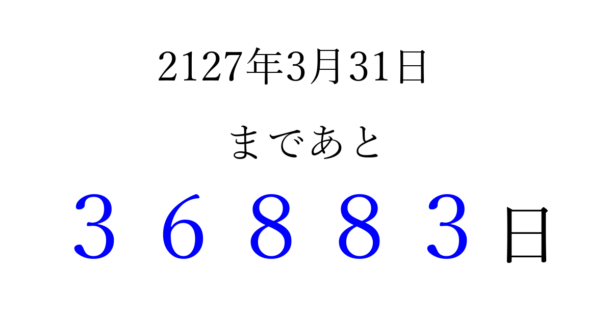 2127年3月31日(月)まで あと 99999 日です 追加すると、トップページからすぐ選べるようになります ※2026/04/06現在の結果です。 最新の状態に更新する ↓シェアして、タイムライン上にカウントダウンを表示しよう!↓ 📤 この結果を共有する Tweet シェア Threads Bluesky 別の日付でカウントダウン 2127年3月のカレンダー このページをブックマークに追加すると、いつでもカウントダウンを確認できます。 (PC: Ctrl+D / Mac: ⌘+D) hitome-notes.comでは以下のページも運営しています。 指定日と期間から日付を計算 | ガチャ確率計算・シミュレーション | プライバシー・ポリシー 運営者:Avocado