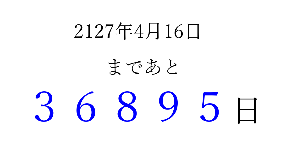 2127年4月16日(水)まで あと 99999 日です 追加すると、トップページからすぐ選べるようになります ※2026/04/10現在の結果です。 最新の状態に更新する ↓シェアして、タイムライン上にカウントダウンを表示しよう!↓ 📤 この結果を共有する Tweet シェア Threads Bluesky 別の日付でカウントダウン 2127年4月のカレンダー このページをブックマークに追加すると、いつでもカウントダウンを確認できます。 (PC: Ctrl+D / Mac: ⌘+D) hitome-notes.comでは以下のページも運営しています。 指定日と期間から日付を計算 | ガチャ確率計算・シミュレーション | プライバシー・ポリシー 運営者:Avocado