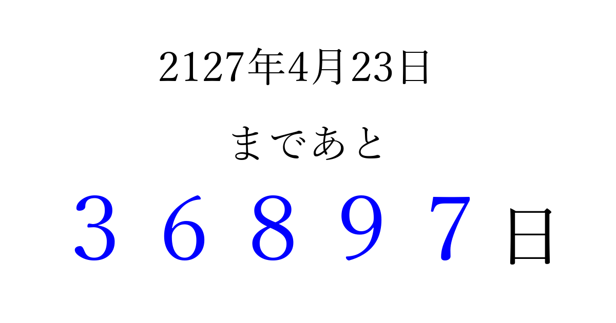 2127年4月23日(水)まで あと 99999 日です 追加すると、トップページからすぐ選べるようになります ※2026/04/15現在の結果です。 最新の状態に更新する ↓シェアして、タイムライン上にカウントダウンを表示しよう!↓ 📤 この結果を共有する Tweet シェア Threads Bluesky 別の日付でカウントダウン 2127年4月のカレンダー このページをブックマークに追加すると、いつでもカウントダウンを確認できます。 (PC: Ctrl+D / Mac: ⌘+D) hitome-notes.comでは以下のページも運営しています。 指定日と期間から日付を計算 | ガチャ確率計算・シミュレーション | プライバシー・ポリシー 運営者:Avocado