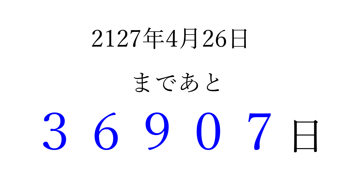 2127年4月26日(土)まで あと 99999 日です 追加すると、トップページからすぐ選べるようになります ※2026/04/08現在の結果です。 最新の状態に更新する ↓シェアして、タイムライン上にカウントダウンを表示しよう!↓ 📤 この結果を共有する Tweet シェア Threads Bluesky 別の日付でカウントダウン 2127年4月のカレンダー このページをブックマークに追加すると、いつでもカウントダウンを確認できます。 (PC: Ctrl+D / Mac: ⌘+D) hitome-notes.comでは以下のページも運営しています。 指定日と期間から日付を計算 | ガチャ確率計算・シミュレーション | プライバシー・ポリシー 運営者:Avocado