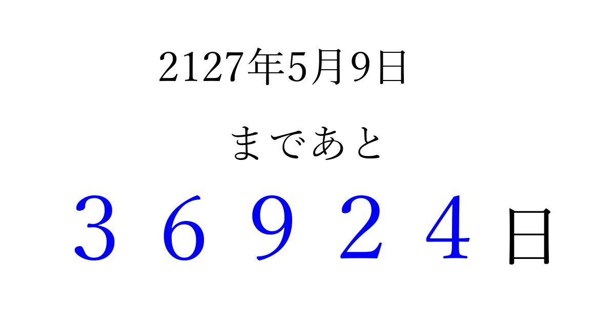 2127年5月9日(金)まで あと 99999 日です 追加すると、トップページからすぐ選べるようになります ※2026/04/04現在の結果です。 最新の状態に更新する ↓シェアして、タイムライン上にカウントダウンを表示しよう!↓ 📤 この結果を共有する Tweet シェア Threads Bluesky 別の日付でカウントダウン 2127年5月のカレンダー このページをブックマークに追加すると、いつでもカウントダウンを確認できます。 (PC: Ctrl+D / Mac: ⌘+D) hitome-notes.comでは以下のページも運営しています。 指定日と期間から日付を計算 | ガチャ確率計算・シミュレーション | プライバシー・ポリシー 運営者:Avocado