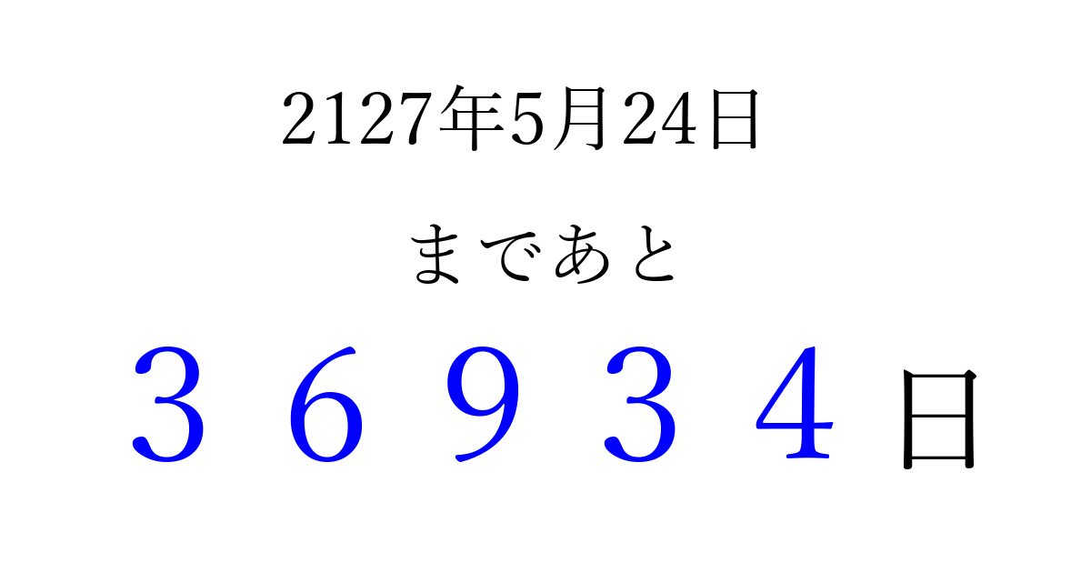 2127年5月24日(土)まで あと 99999 日です 追加すると、トップページからすぐ選べるようになります ※2026/04/09現在の結果です。 最新の状態に更新する ↓シェアして、タイムライン上にカウントダウンを表示しよう!↓ 📤 この結果を共有する Tweet シェア Threads Bluesky 別の日付でカウントダウン 2127年5月のカレンダー このページをブックマークに追加すると、いつでもカウントダウンを確認できます。 (PC: Ctrl+D / Mac: ⌘+D) hitome-notes.comでは以下のページも運営しています。 指定日と期間から日付を計算 | ガチャ確率計算・シミュレーション | プライバシー・ポリシー 運営者:Avocado