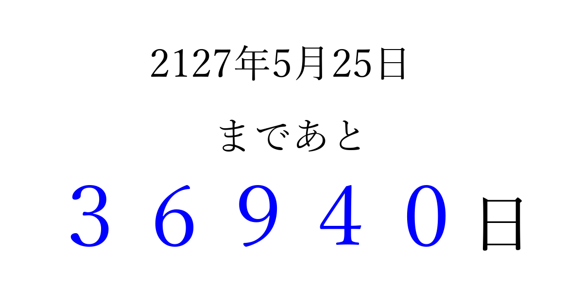 2127年5月25日(日)まで あと 99999 日です 追加すると、トップページからすぐ選べるようになります ※2026/04/04現在の結果です。 最新の状態に更新する ↓シェアして、タイムライン上にカウントダウンを表示しよう!↓ 📤 この結果を共有する Tweet シェア Threads Bluesky 別の日付でカウントダウン 2127年5月のカレンダー このページをブックマークに追加すると、いつでもカウントダウンを確認できます。 (PC: Ctrl+D / Mac: ⌘+D) hitome-notes.comでは以下のページも運営しています。 指定日と期間から日付を計算 | ガチャ確率計算・シミュレーション | プライバシー・ポリシー 運営者:Avocado