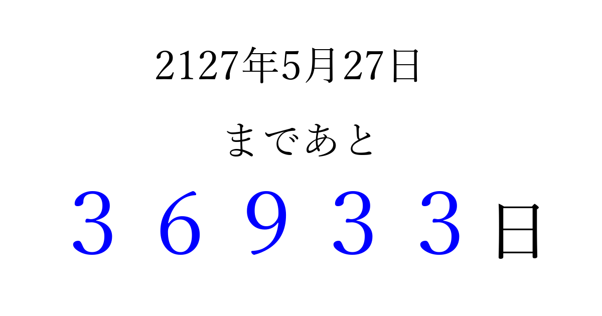 2127年5月27日(火)まで あと 99999 日です 追加すると、トップページからすぐ選べるようになります ※2026/04/13現在の結果です。 最新の状態に更新する ↓シェアして、タイムライン上にカウントダウンを表示しよう!↓ 📤 この結果を共有する Tweet シェア Threads Bluesky 別の日付でカウントダウン 2127年5月のカレンダー このページをブックマークに追加すると、いつでもカウントダウンを確認できます。 (PC: Ctrl+D / Mac: ⌘+D) hitome-notes.comでは以下のページも運営しています。 指定日と期間から日付を計算 | ガチャ確率計算・シミュレーション | プライバシー・ポリシー 運営者:Avocado