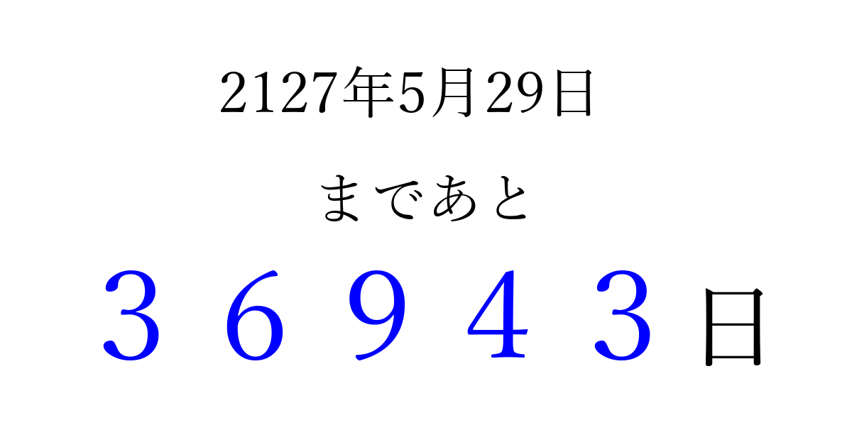 2127年5月29日(木)まで あと 99999 日です 追加すると、トップページからすぐ選べるようになります ※2026/04/05現在の結果です。 最新の状態に更新する ↓シェアして、タイムライン上にカウントダウンを表示しよう!↓ 📤 この結果を共有する Tweet シェア Threads Bluesky 別の日付でカウントダウン 2127年5月のカレンダー このページをブックマークに追加すると、いつでもカウントダウンを確認できます。 (PC: Ctrl+D / Mac: ⌘+D) hitome-notes.comでは以下のページも運営しています。 指定日と期間から日付を計算 | ガチャ確率計算・シミュレーション | プライバシー・ポリシー 運営者:Avocado