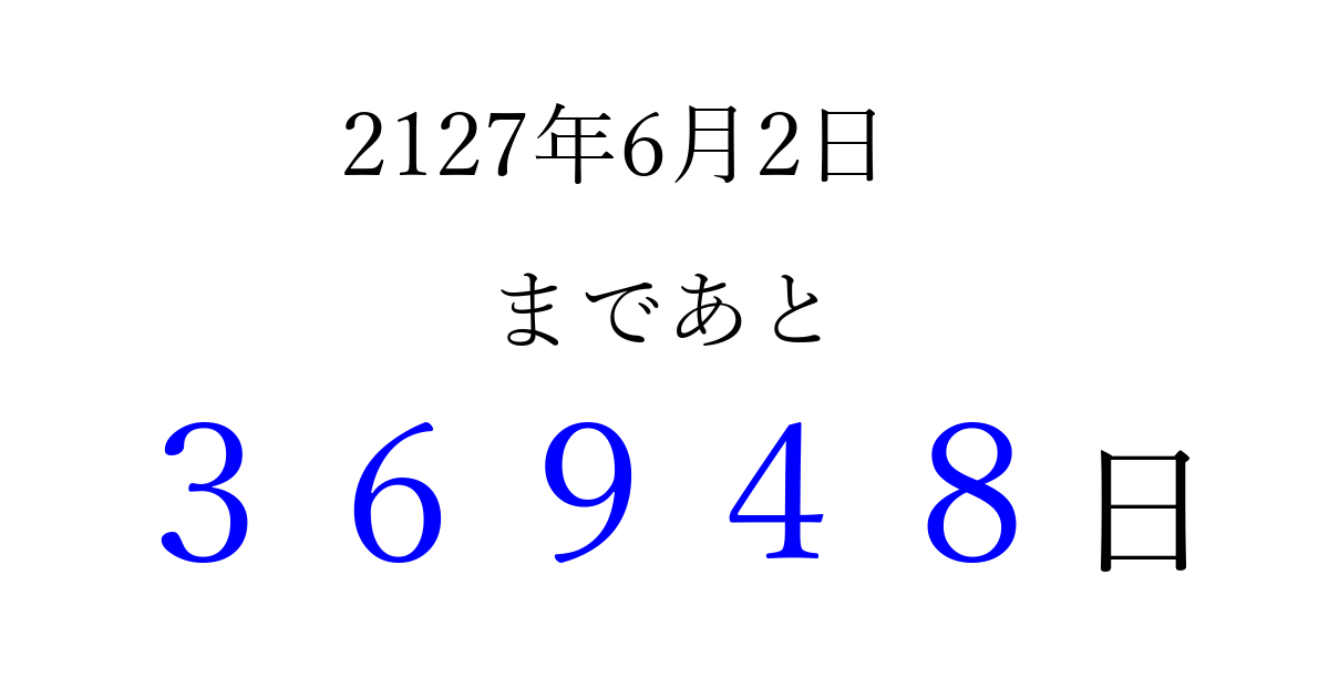 2127年6月2日(月)まで あと 99999 日です 追加すると、トップページからすぐ選べるようになります ※2026/04/04現在の結果です。 最新の状態に更新する ↓シェアして、タイムライン上にカウントダウンを表示しよう!↓ 📤 この結果を共有する Tweet シェア Threads Bluesky 別の日付でカウントダウン 2127年6月のカレンダー このページをブックマークに追加すると、いつでもカウントダウンを確認できます。 (PC: Ctrl+D / Mac: ⌘+D) hitome-notes.comでは以下のページも運営しています。 指定日と期間から日付を計算 | ガチャ確率計算・シミュレーション | プライバシー・ポリシー 運営者:Avocado