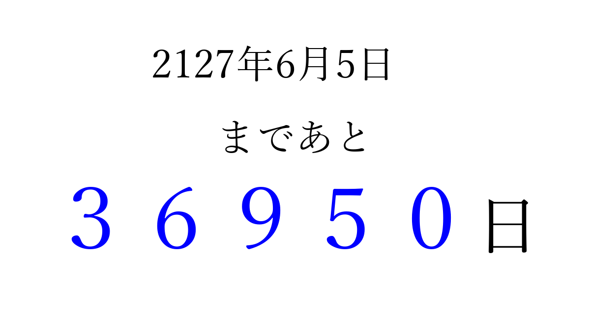 2127年6月5日(木)まで あと 99999 日です 追加すると、トップページからすぐ選べるようになります ※2026/04/05現在の結果です。 最新の状態に更新する ↓シェアして、タイムライン上にカウントダウンを表示しよう!↓ 📤 この結果を共有する Tweet シェア Threads Bluesky 別の日付でカウントダウン 2127年6月のカレンダー このページをブックマークに追加すると、いつでもカウントダウンを確認できます。 (PC: Ctrl+D / Mac: ⌘+D) hitome-notes.comでは以下のページも運営しています。 指定日と期間から日付を計算 | ガチャ確率計算・シミュレーション | プライバシー・ポリシー 運営者:Avocado