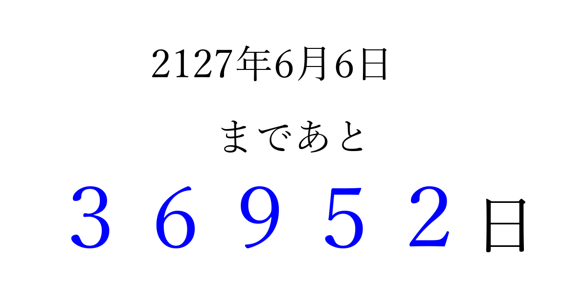 2127年6月6日(金)まで あと 99999 日です 追加すると、トップページからすぐ選べるようになります ※2026/04/04現在の結果です。 最新の状態に更新する ↓シェアして、タイムライン上にカウントダウンを表示しよう!↓ 📤 この結果を共有する Tweet シェア Threads Bluesky 別の日付でカウントダウン 2127年6月のカレンダー このページをブックマークに追加すると、いつでもカウントダウンを確認できます。 (PC: Ctrl+D / Mac: ⌘+D) hitome-notes.comでは以下のページも運営しています。 指定日と期間から日付を計算 | ガチャ確率計算・シミュレーション | プライバシー・ポリシー 運営者:Avocado