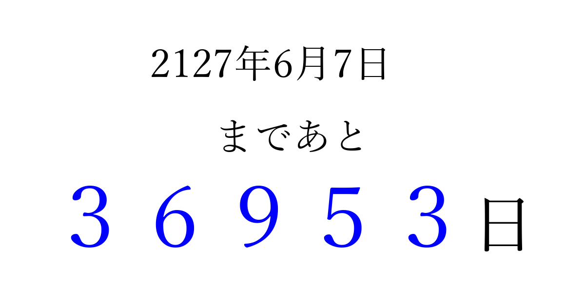 2127年6月7日(土)まで あと 99999 日です 追加すると、トップページからすぐ選べるようになります ※2026/04/04現在の結果です。 最新の状態に更新する ↓シェアして、タイムライン上にカウントダウンを表示しよう!↓ 📤 この結果を共有する Tweet シェア Threads Bluesky 別の日付でカウントダウン 2127年6月のカレンダー このページをブックマークに追加すると、いつでもカウントダウンを確認できます。 (PC: Ctrl+D / Mac: ⌘+D) hitome-notes.comでは以下のページも運営しています。 指定日と期間から日付を計算 | ガチャ確率計算・シミュレーション | プライバシー・ポリシー 運営者:Avocado