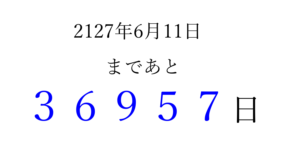 2127年6月11日(水)まで あと 99999 日です 追加すると、トップページからすぐ選べるようになります ※2026/04/04現在の結果です。 最新の状態に更新する ↓シェアして、タイムライン上にカウントダウンを表示しよう!↓ 📤 この結果を共有する Tweet シェア Threads Bluesky 別の日付でカウントダウン 2127年6月のカレンダー このページをブックマークに追加すると、いつでもカウントダウンを確認できます。 (PC: Ctrl+D / Mac: ⌘+D) hitome-notes.comでは以下のページも運営しています。 指定日と期間から日付を計算 | ガチャ確率計算・シミュレーション | プライバシー・ポリシー 運営者:Avocado
