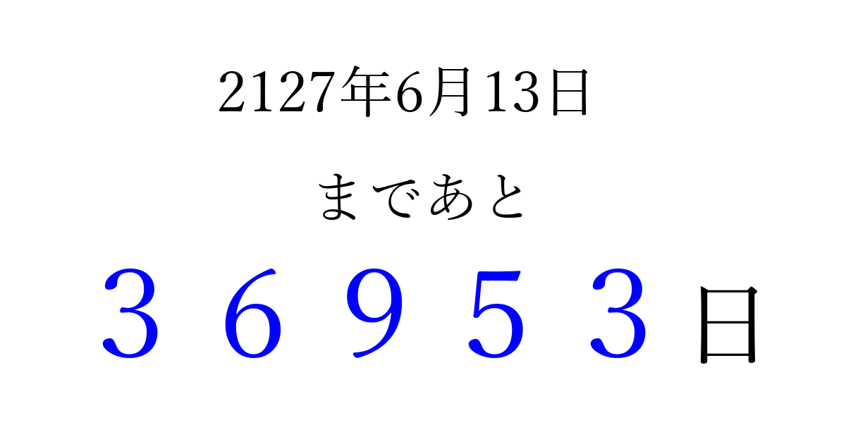2127年6月13日(金)まで あと 99999 日です 追加すると、トップページからすぐ選べるようになります ※2026/04/10現在の結果です。 最新の状態に更新する ↓シェアして、タイムライン上にカウントダウンを表示しよう!↓ 📤 この結果を共有する Tweet シェア Threads Bluesky 別の日付でカウントダウン 2127年6月のカレンダー このページをブックマークに追加すると、いつでもカウントダウンを確認できます。 (PC: Ctrl+D / Mac: ⌘+D) hitome-notes.comでは以下のページも運営しています。 指定日と期間から日付を計算 | ガチャ確率計算・シミュレーション | プライバシー・ポリシー 運営者:Avocado