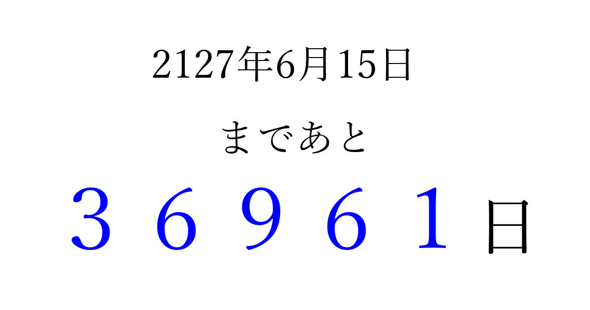 2127年6月15日(日)まで あと 99999 日です 追加すると、トップページからすぐ選べるようになります ※2026/04/04現在の結果です。 最新の状態に更新する ↓シェアして、タイムライン上にカウントダウンを表示しよう!↓ 📤 この結果を共有する Tweet シェア Threads Bluesky 別の日付でカウントダウン 2127年6月のカレンダー このページをブックマークに追加すると、いつでもカウントダウンを確認できます。 (PC: Ctrl+D / Mac: ⌘+D) hitome-notes.comでは以下のページも運営しています。 指定日と期間から日付を計算 | ガチャ確率計算・シミュレーション | プライバシー・ポリシー 運営者:Avocado