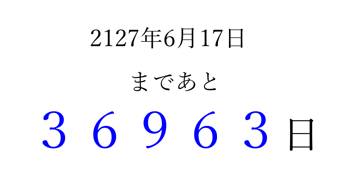 2127年6月17日(火)まで あと 99999 日です 追加すると、トップページからすぐ選べるようになります ※2026/04/04現在の結果です。 最新の状態に更新する ↓シェアして、タイムライン上にカウントダウンを表示しよう!↓ 📤 この結果を共有する Tweet シェア Threads Bluesky 別の日付でカウントダウン 2127年6月のカレンダー このページをブックマークに追加すると、いつでもカウントダウンを確認できます。 (PC: Ctrl+D / Mac: ⌘+D) hitome-notes.comでは以下のページも運営しています。 指定日と期間から日付を計算 | ガチャ確率計算・シミュレーション | プライバシー・ポリシー 運営者:Avocado