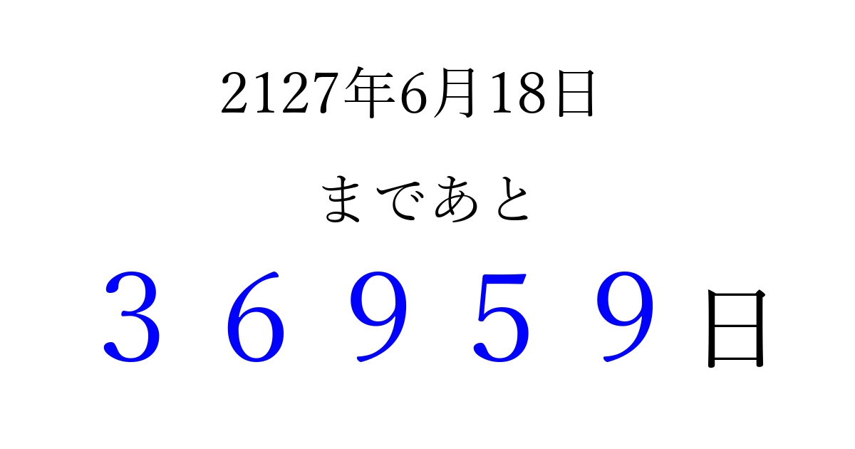 2127年6月18日(水)まで あと 99999 日です 追加すると、トップページからすぐ選べるようになります ※2026/04/09現在の結果です。 最新の状態に更新する ↓シェアして、タイムライン上にカウントダウンを表示しよう!↓ 📤 この結果を共有する Tweet シェア Threads Bluesky 別の日付でカウントダウン 2127年6月のカレンダー このページをブックマークに追加すると、いつでもカウントダウンを確認できます。 (PC: Ctrl+D / Mac: ⌘+D) hitome-notes.comでは以下のページも運営しています。 指定日と期間から日付を計算 | ガチャ確率計算・シミュレーション | プライバシー・ポリシー 運営者:Avocado