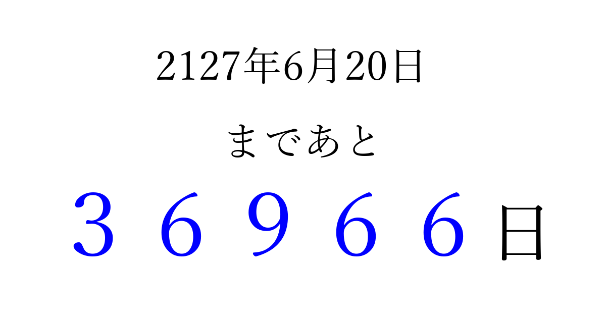 2127年6月20日(金)まで あと 99999 日です 追加すると、トップページからすぐ選べるようになります ※2026/04/04現在の結果です。 最新の状態に更新する ↓シェアして、タイムライン上にカウントダウンを表示しよう!↓ 📤 この結果を共有する Tweet シェア Threads Bluesky 別の日付でカウントダウン 2127年6月のカレンダー このページをブックマークに追加すると、いつでもカウントダウンを確認できます。 (PC: Ctrl+D / Mac: ⌘+D) hitome-notes.comでは以下のページも運営しています。 指定日と期間から日付を計算 | ガチャ確率計算・シミュレーション | プライバシー・ポリシー 運営者:Avocado