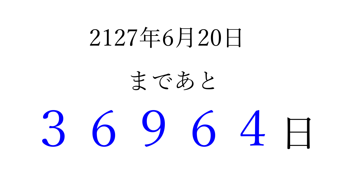 2127年6月20日(金)まで あと 99999 日です 追加すると、トップページからすぐ選べるようになります ※2026/04/06現在の結果です。 最新の状態に更新する ↓シェアして、タイムライン上にカウントダウンを表示しよう!↓ 📤 この結果を共有する Tweet シェア Threads Bluesky 別の日付でカウントダウン 2127年6月のカレンダー このページをブックマークに追加すると、いつでもカウントダウンを確認できます。 (PC: Ctrl+D / Mac: ⌘+D) hitome-notes.comでは以下のページも運営しています。 指定日と期間から日付を計算 | ガチャ確率計算・シミュレーション | プライバシー・ポリシー 運営者:Avocado