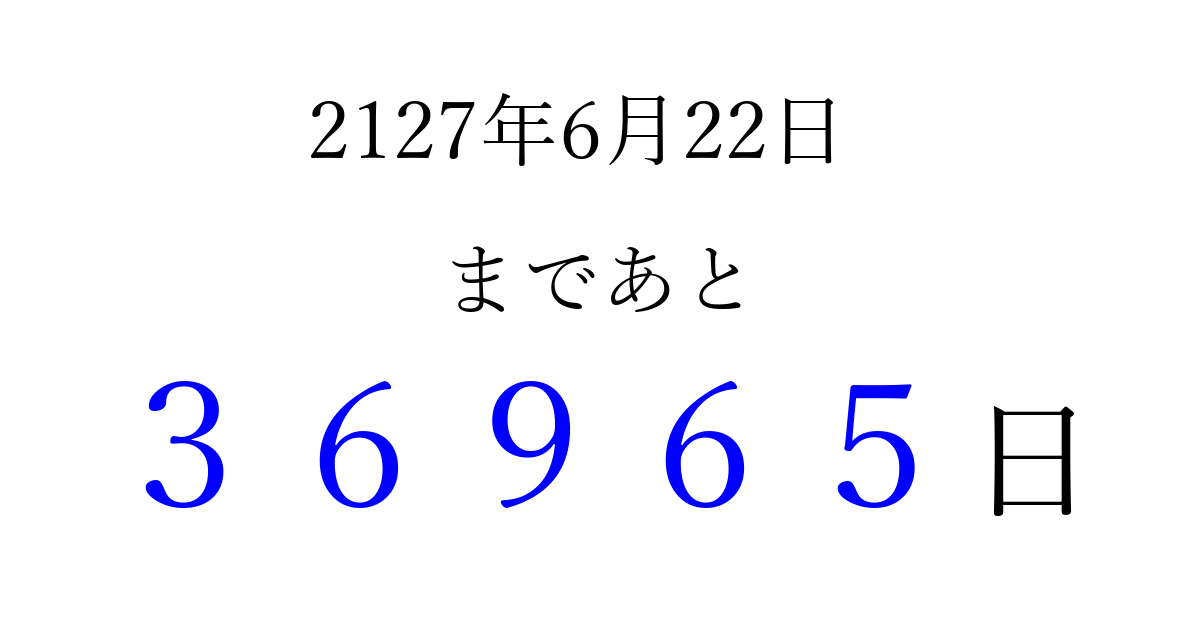 2127年6月22日(日)まで あと 99999 日です 追加すると、トップページからすぐ選べるようになります ※2026/04/07現在の結果です。 最新の状態に更新する ↓シェアして、タイムライン上にカウントダウンを表示しよう!↓ 📤 この結果を共有する Tweet シェア Threads Bluesky 別の日付でカウントダウン 2127年6月のカレンダー このページをブックマークに追加すると、いつでもカウントダウンを確認できます。 (PC: Ctrl+D / Mac: ⌘+D) hitome-notes.comでは以下のページも運営しています。 指定日と期間から日付を計算 | ガチャ確率計算・シミュレーション | プライバシー・ポリシー 運営者:Avocado