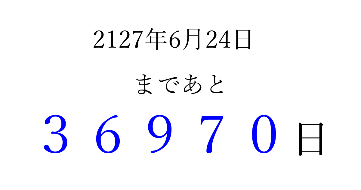 2127年6月24日(火)まで あと 99999 日です 追加すると、トップページからすぐ選べるようになります ※2026/04/04現在の結果です。 最新の状態に更新する ↓シェアして、タイムライン上にカウントダウンを表示しよう!↓ 📤 この結果を共有する Tweet シェア Threads Bluesky 別の日付でカウントダウン 2127年6月のカレンダー このページをブックマークに追加すると、いつでもカウントダウンを確認できます。 (PC: Ctrl+D / Mac: ⌘+D) hitome-notes.comでは以下のページも運営しています。 指定日と期間から日付を計算 | ガチャ確率計算・シミュレーション | プライバシー・ポリシー 運営者:Avocado