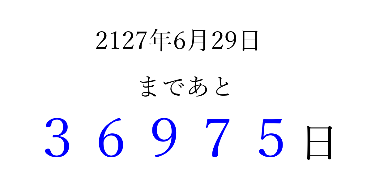 2127年6月29日(日)まで あと 99999 日です 追加すると、トップページからすぐ選べるようになります ※2026/04/04現在の結果です。 最新の状態に更新する ↓シェアして、タイムライン上にカウントダウンを表示しよう!↓ 📤 この結果を共有する Tweet シェア Threads Bluesky 別の日付でカウントダウン 2127年6月のカレンダー このページをブックマークに追加すると、いつでもカウントダウンを確認できます。 (PC: Ctrl+D / Mac: ⌘+D) hitome-notes.comでは以下のページも運営しています。 指定日と期間から日付を計算 | ガチャ確率計算・シミュレーション | プライバシー・ポリシー 運営者:Avocado
