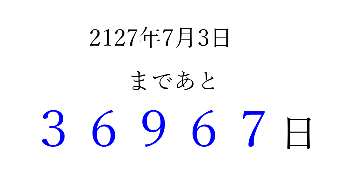 2127年7月3日(木)まで あと 99999 日です 追加すると、トップページからすぐ選べるようになります ※2026/04/16現在の結果です。 最新の状態に更新する ↓シェアして、タイムライン上にカウントダウンを表示しよう!↓ 📤 この結果を共有する Tweet シェア Threads Bluesky 別の日付でカウントダウン 2127年7月のカレンダー このページをブックマークに追加すると、いつでもカウントダウンを確認できます。 (PC: Ctrl+D / Mac: ⌘+D) hitome-notes.comでは以下のページも運営しています。 指定日と期間から日付を計算 | ガチャ確率計算・シミュレーション | プライバシー・ポリシー 運営者:Avocado