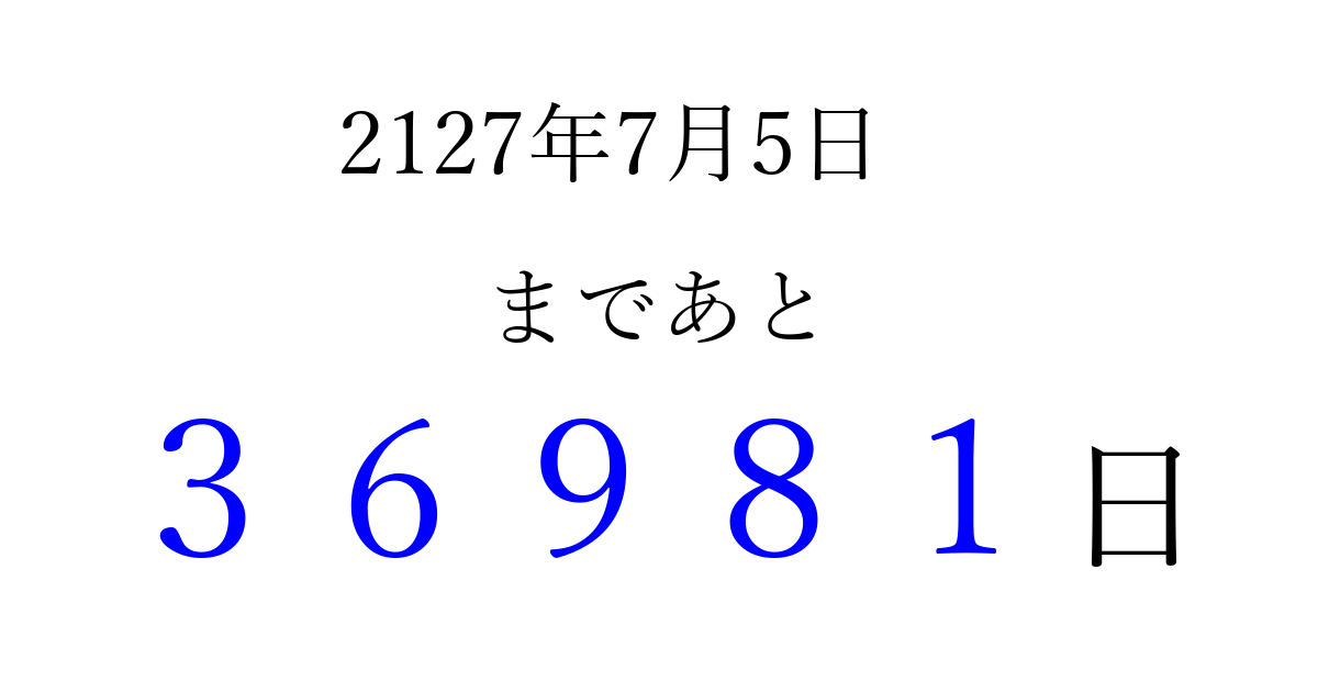 2127年7月5日(土)まで あと 99999 日です 追加すると、トップページからすぐ選べるようになります ※2026/04/04現在の結果です。 最新の状態に更新する ↓シェアして、タイムライン上にカウントダウンを表示しよう!↓ 📤 この結果を共有する Tweet シェア Threads Bluesky 別の日付でカウントダウン 2127年7月のカレンダー このページをブックマークに追加すると、いつでもカウントダウンを確認できます。 (PC: Ctrl+D / Mac: ⌘+D) hitome-notes.comでは以下のページも運営しています。 指定日と期間から日付を計算 | ガチャ確率計算・シミュレーション | プライバシー・ポリシー 運営者:Avocado