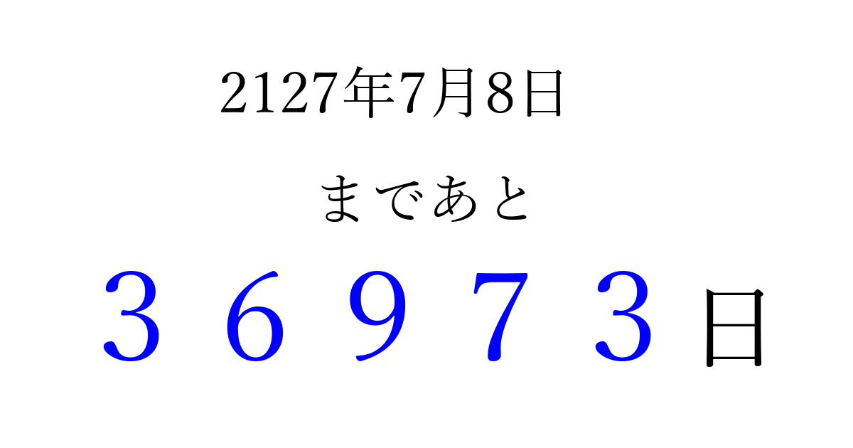 2127年7月8日(火)まで あと 99999 日です 追加すると、トップページからすぐ選べるようになります ※2026/04/15現在の結果です。 最新の状態に更新する ↓シェアして、タイムライン上にカウントダウンを表示しよう!↓ 📤 この結果を共有する Tweet シェア Threads Bluesky 別の日付でカウントダウン 2127年7月のカレンダー このページをブックマークに追加すると、いつでもカウントダウンを確認できます。 (PC: Ctrl+D / Mac: ⌘+D) hitome-notes.comでは以下のページも運営しています。 指定日と期間から日付を計算 | ガチャ確率計算・シミュレーション | プライバシー・ポリシー 運営者:Avocado