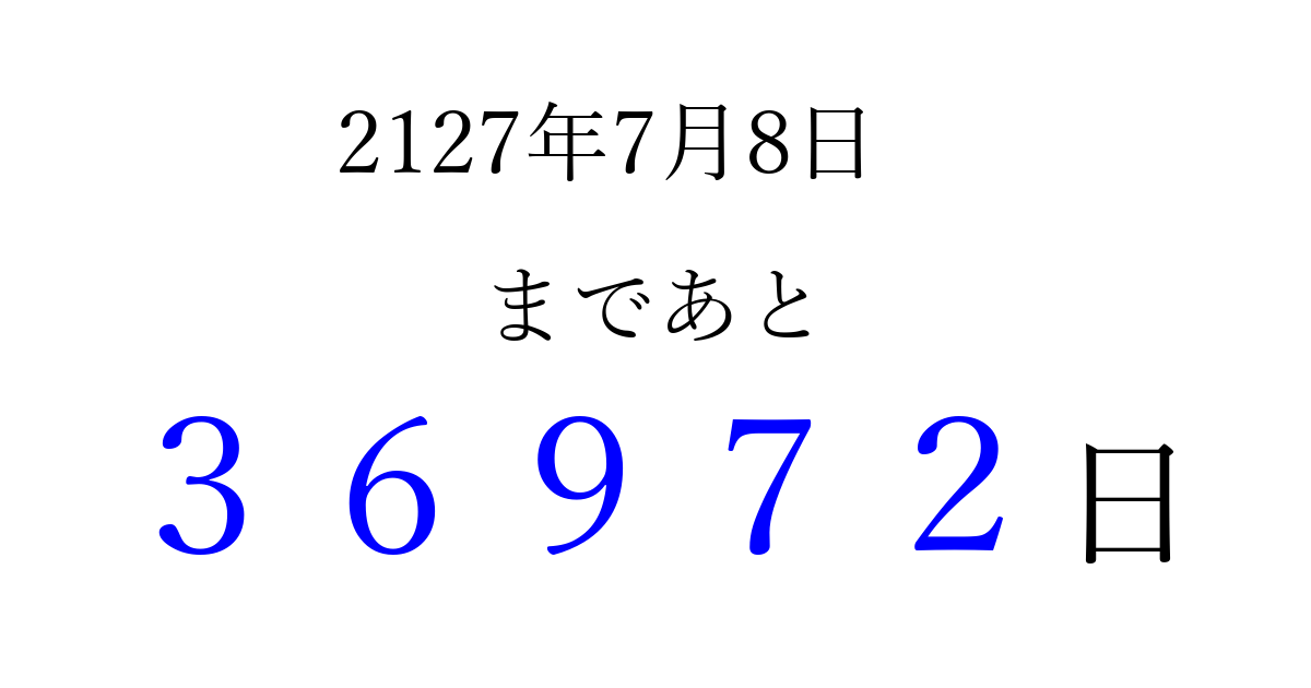 2127年7月8日(火)まで あと 99999 日です 追加すると、トップページからすぐ選べるようになります ※2026/04/16現在の結果です。 最新の状態に更新する ↓シェアして、タイムライン上にカウントダウンを表示しよう!↓ 📤 この結果を共有する Tweet シェア Threads Bluesky 別の日付でカウントダウン 2127年7月のカレンダー このページをブックマークに追加すると、いつでもカウントダウンを確認できます。 (PC: Ctrl+D / Mac: ⌘+D) hitome-notes.comでは以下のページも運営しています。 指定日と期間から日付を計算 | ガチャ確率計算・シミュレーション | プライバシー・ポリシー 運営者:Avocado