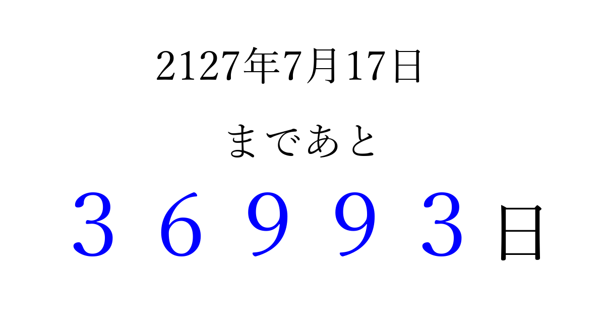 2127年7月17日(木)まで あと 99999 日です 追加すると、トップページからすぐ選べるようになります ※2026/04/04現在の結果です。 最新の状態に更新する ↓シェアして、タイムライン上にカウントダウンを表示しよう!↓ 📤 この結果を共有する Tweet シェア Threads Bluesky 別の日付でカウントダウン 2127年7月のカレンダー このページをブックマークに追加すると、いつでもカウントダウンを確認できます。 (PC: Ctrl+D / Mac: ⌘+D) hitome-notes.comでは以下のページも運営しています。 指定日と期間から日付を計算 | ガチャ確率計算・シミュレーション | プライバシー・ポリシー 運営者:Avocado