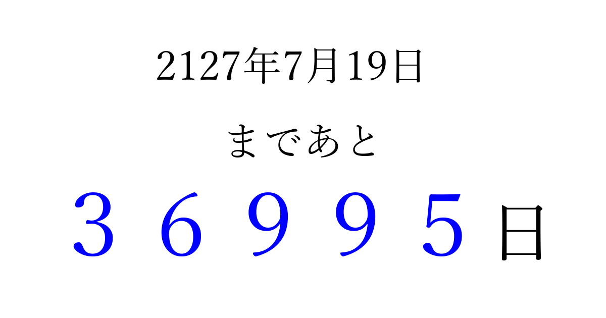 2127年7月19日(土)まで あと 99999 日です 追加すると、トップページからすぐ選べるようになります ※2026/04/04現在の結果です。 最新の状態に更新する ↓シェアして、タイムライン上にカウントダウンを表示しよう!↓ 📤 この結果を共有する Tweet シェア Threads Bluesky 別の日付でカウントダウン 2127年7月のカレンダー このページをブックマークに追加すると、いつでもカウントダウンを確認できます。 (PC: Ctrl+D / Mac: ⌘+D) hitome-notes.comでは以下のページも運営しています。 指定日と期間から日付を計算 | ガチャ確率計算・シミュレーション | プライバシー・ポリシー 運営者:Avocado