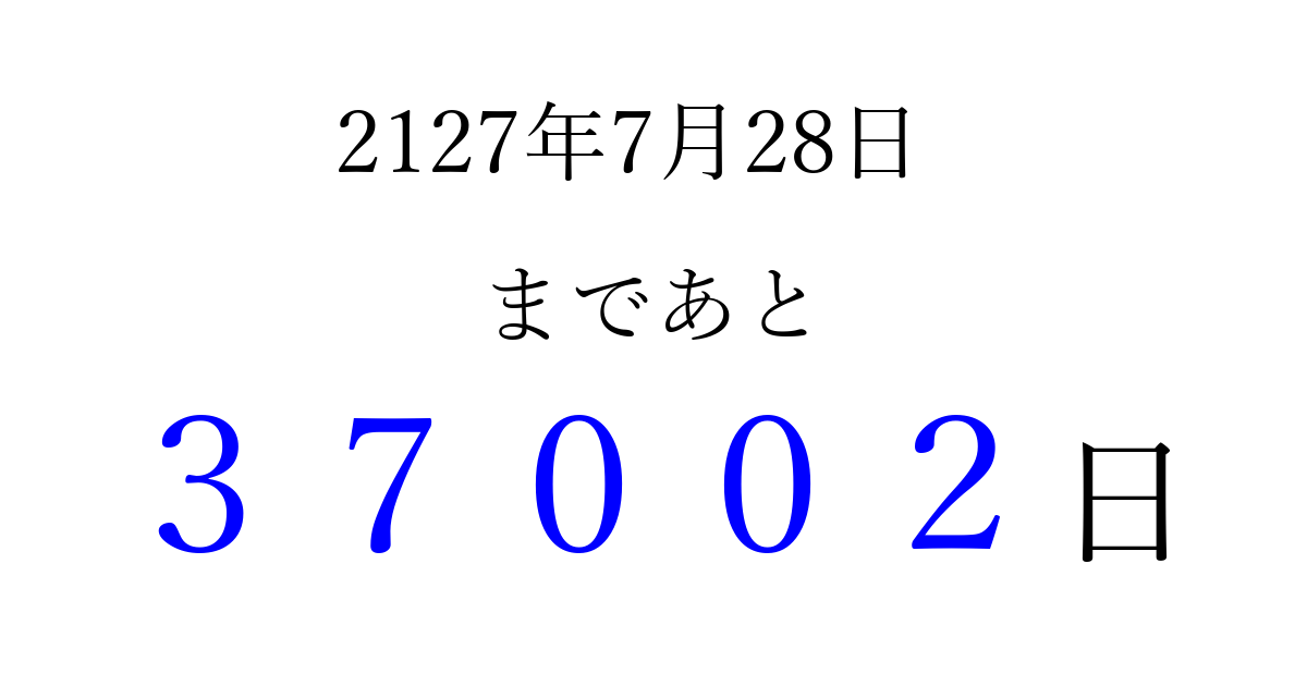 2127年7月28日(月)まで あと 99999 日です 追加すると、トップページからすぐ選べるようになります ※2026/04/06現在の結果です。 最新の状態に更新する ↓シェアして、タイムライン上にカウントダウンを表示しよう!↓ 📤 この結果を共有する Tweet シェア Threads Bluesky 別の日付でカウントダウン 2127年7月のカレンダー このページをブックマークに追加すると、いつでもカウントダウンを確認できます。 (PC: Ctrl+D / Mac: ⌘+D) hitome-notes.comでは以下のページも運営しています。 指定日と期間から日付を計算 | ガチャ確率計算・シミュレーション | プライバシー・ポリシー 運営者:Avocado