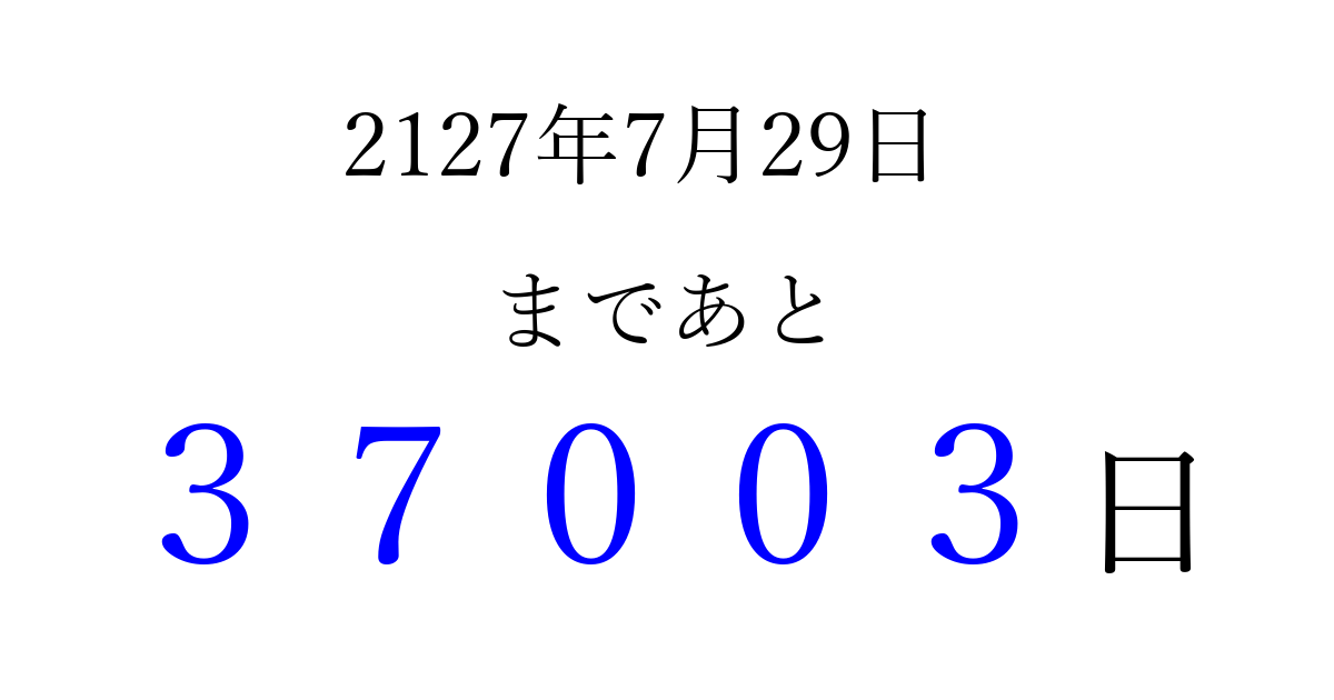 2127年7月29日(火)まで あと 99999 日です 追加すると、トップページからすぐ選べるようになります ※2026/04/06現在の結果です。 最新の状態に更新する ↓シェアして、タイムライン上にカウントダウンを表示しよう!↓ 📤 この結果を共有する Tweet シェア Threads Bluesky 別の日付でカウントダウン 2127年7月のカレンダー このページをブックマークに追加すると、いつでもカウントダウンを確認できます。 (PC: Ctrl+D / Mac: ⌘+D) hitome-notes.comでは以下のページも運営しています。 指定日と期間から日付を計算 | ガチャ確率計算・シミュレーション | プライバシー・ポリシー 運営者:Avocado