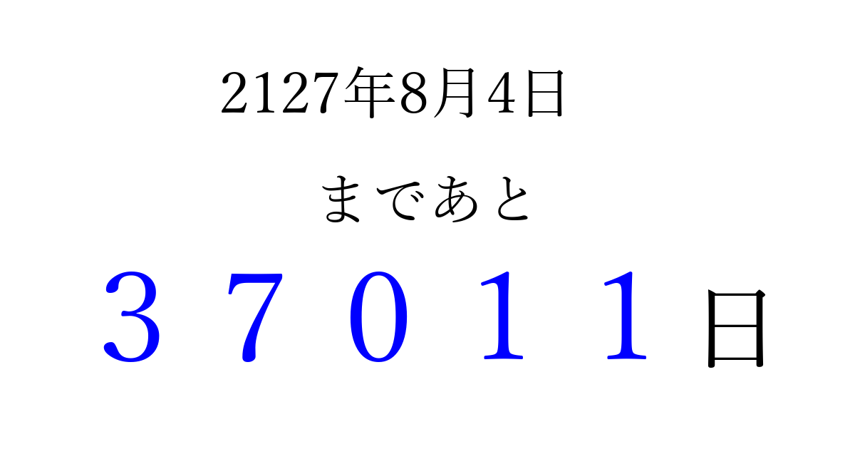 2127年8月4日(月)まで あと 99999 日です 追加すると、トップページからすぐ選べるようになります ※2026/04/04現在の結果です。 最新の状態に更新する ↓シェアして、タイムライン上にカウントダウンを表示しよう!↓ 📤 この結果を共有する Tweet シェア Threads Bluesky 別の日付でカウントダウン 2127年8月のカレンダー このページをブックマークに追加すると、いつでもカウントダウンを確認できます。 (PC: Ctrl+D / Mac: ⌘+D) hitome-notes.comでは以下のページも運営しています。 指定日と期間から日付を計算 | ガチャ確率計算・シミュレーション | プライバシー・ポリシー 運営者:Avocado