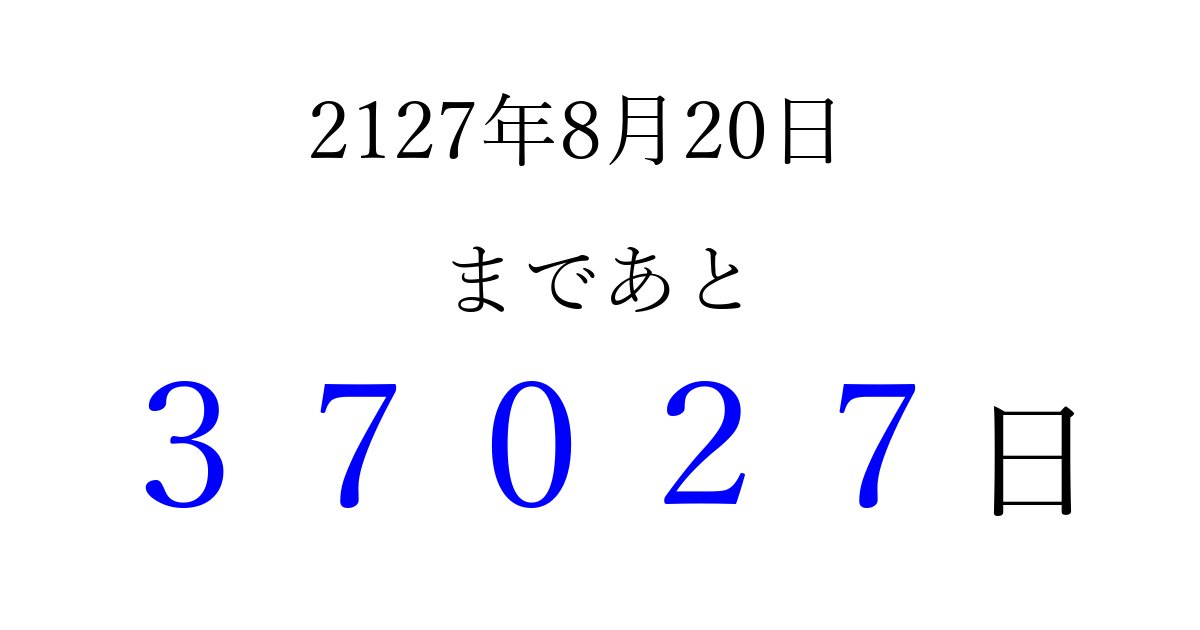 2127年8月20日(水)まで あと 99999 日です 追加すると、トップページからすぐ選べるようになります ※2026/04/04現在の結果です。 最新の状態に更新する ↓シェアして、タイムライン上にカウントダウンを表示しよう!↓ 📤 この結果を共有する Tweet シェア Threads Bluesky 別の日付でカウントダウン 2127年8月のカレンダー このページをブックマークに追加すると、いつでもカウントダウンを確認できます。 (PC: Ctrl+D / Mac: ⌘+D) hitome-notes.comでは以下のページも運営しています。 指定日と期間から日付を計算 | ガチャ確率計算・シミュレーション | プライバシー・ポリシー 運営者:Avocado