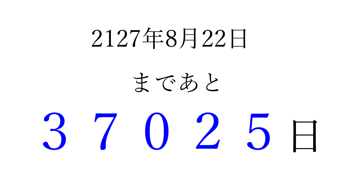 2127年8月22日(金)まで あと 99999 日です 追加すると、トップページからすぐ選べるようになります ※2026/04/08現在の結果です。 最新の状態に更新する ↓シェアして、タイムライン上にカウントダウンを表示しよう!↓ 📤 この結果を共有する Tweet シェア Threads Bluesky 別の日付でカウントダウン 2127年8月のカレンダー このページをブックマークに追加すると、いつでもカウントダウンを確認できます。 (PC: Ctrl+D / Mac: ⌘+D) hitome-notes.comでは以下のページも運営しています。 指定日と期間から日付を計算 | ガチャ確率計算・シミュレーション | プライバシー・ポリシー 運営者:Avocado