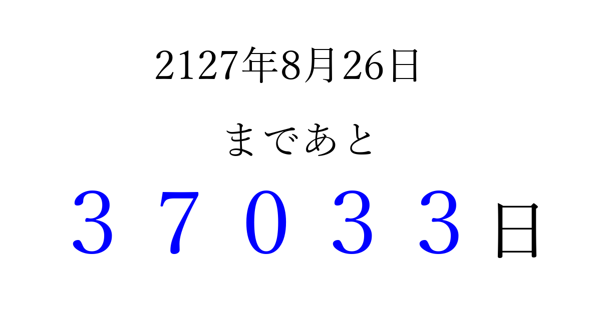 2127年8月26日(火)まで あと 99999 日です 追加すると、トップページからすぐ選べるようになります ※2026/04/04現在の結果です。 最新の状態に更新する ↓シェアして、タイムライン上にカウントダウンを表示しよう!↓ 📤 この結果を共有する Tweet シェア Threads Bluesky 別の日付でカウントダウン 2127年8月のカレンダー このページをブックマークに追加すると、いつでもカウントダウンを確認できます。 (PC: Ctrl+D / Mac: ⌘+D) hitome-notes.comでは以下のページも運営しています。 指定日と期間から日付を計算 | ガチャ確率計算・シミュレーション | プライバシー・ポリシー 運営者:Avocado