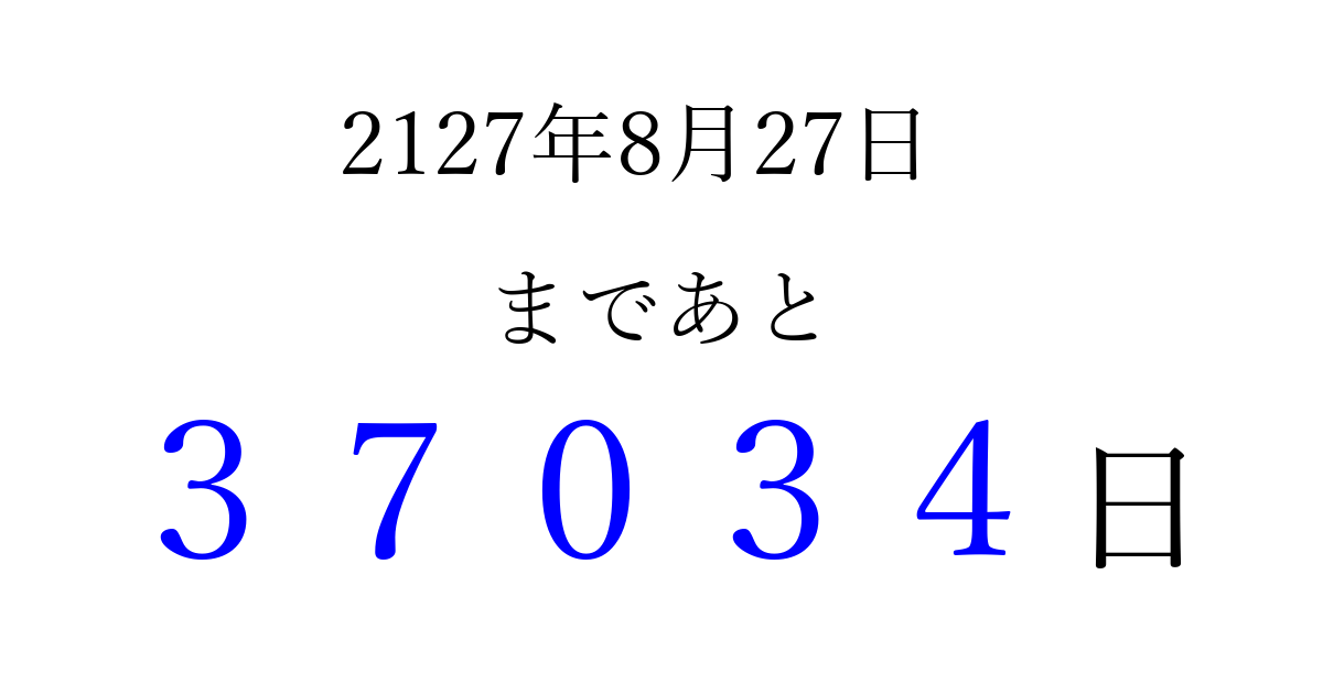 2127年8月27日(水)まで あと 99999 日です 追加すると、トップページからすぐ選べるようになります ※2026/04/04現在の結果です。 最新の状態に更新する ↓シェアして、タイムライン上にカウントダウンを表示しよう!↓ 📤 この結果を共有する Tweet シェア Threads Bluesky 別の日付でカウントダウン 2127年8月のカレンダー このページをブックマークに追加すると、いつでもカウントダウンを確認できます。 (PC: Ctrl+D / Mac: ⌘+D) hitome-notes.comでは以下のページも運営しています。 指定日と期間から日付を計算 | ガチャ確率計算・シミュレーション | プライバシー・ポリシー 運営者:Avocado