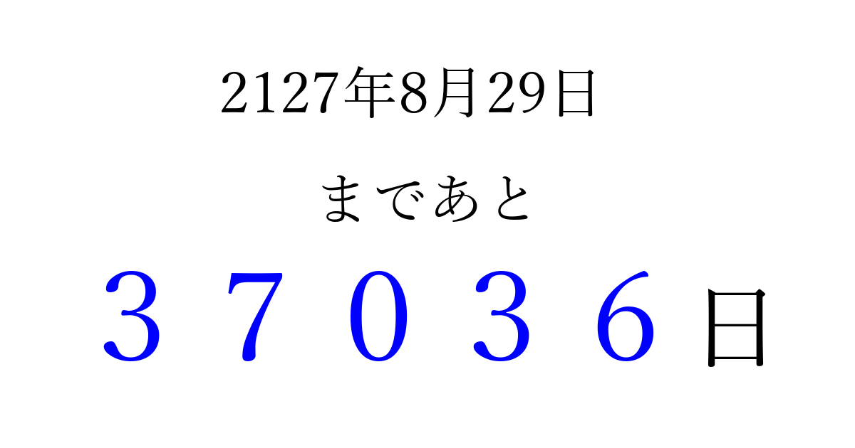 2127年8月29日(金)まで あと 99999 日です 追加すると、トップページからすぐ選べるようになります ※2026/04/04現在の結果です。 最新の状態に更新する ↓シェアして、タイムライン上にカウントダウンを表示しよう!↓ 📤 この結果を共有する Tweet シェア Threads Bluesky 別の日付でカウントダウン 2127年8月のカレンダー このページをブックマークに追加すると、いつでもカウントダウンを確認できます。 (PC: Ctrl+D / Mac: ⌘+D) hitome-notes.comでは以下のページも運営しています。 指定日と期間から日付を計算 | ガチャ確率計算・シミュレーション | プライバシー・ポリシー 運営者:Avocado