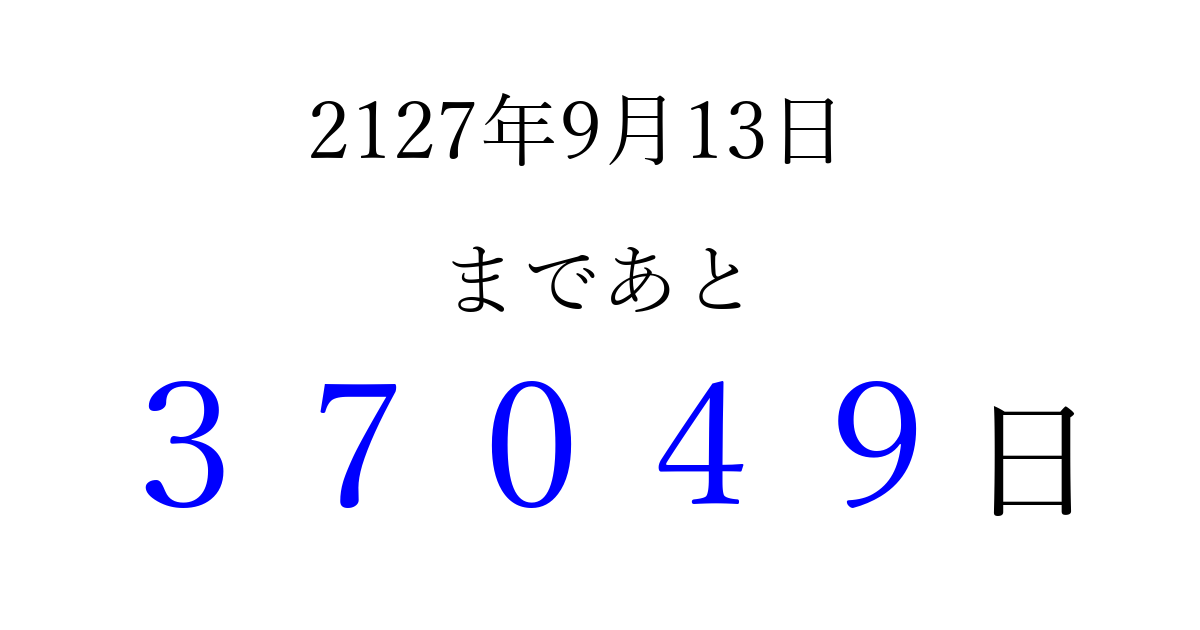 2127年9月13日(土)まで あと 99999 日です 追加すると、トップページからすぐ選べるようになります ※2026/04/06現在の結果です。 最新の状態に更新する ↓シェアして、タイムライン上にカウントダウンを表示しよう!↓ 📤 この結果を共有する Tweet シェア Threads Bluesky 別の日付でカウントダウン 2127年9月のカレンダー このページをブックマークに追加すると、いつでもカウントダウンを確認できます。 (PC: Ctrl+D / Mac: ⌘+D) hitome-notes.comでは以下のページも運営しています。 指定日と期間から日付を計算 | ガチャ確率計算・シミュレーション | プライバシー・ポリシー 運営者:Avocado