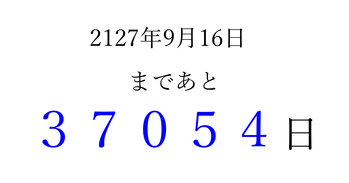2127年9月16日(火)まで あと 99999 日です 追加すると、トップページからすぐ選べるようになります ※2026/04/04現在の結果です。 最新の状態に更新する ↓シェアして、タイムライン上にカウントダウンを表示しよう!↓ 📤 この結果を共有する Tweet シェア Threads Bluesky 別の日付でカウントダウン 2127年9月のカレンダー このページをブックマークに追加すると、いつでもカウントダウンを確認できます。 (PC: Ctrl+D / Mac: ⌘+D) hitome-notes.comでは以下のページも運営しています。 指定日と期間から日付を計算 | ガチャ確率計算・シミュレーション | プライバシー・ポリシー 運営者:Avocado