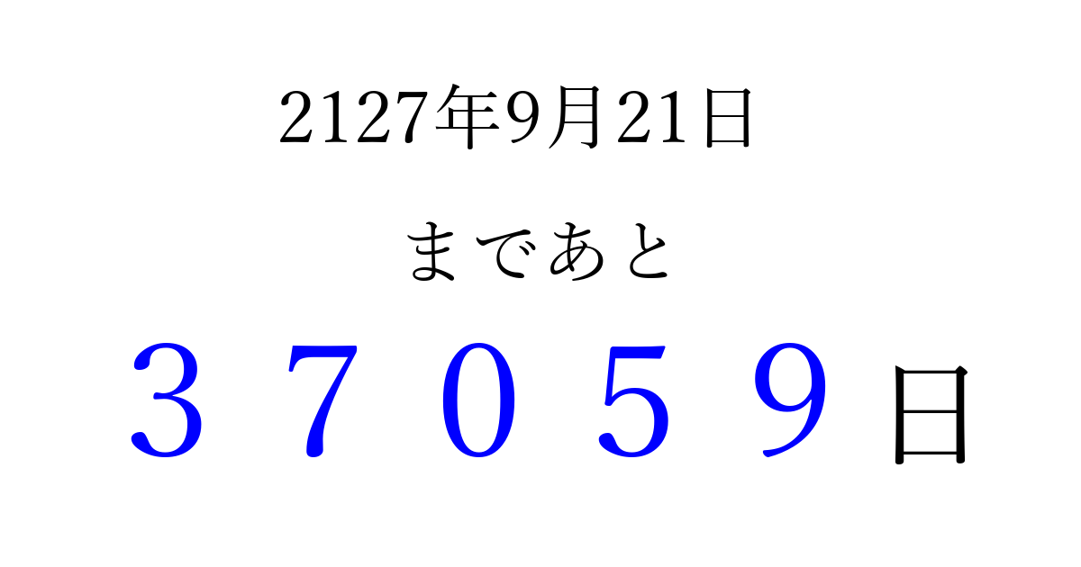 2127年9月21日(日)まで あと 99999 日です 追加すると、トップページからすぐ選べるようになります ※2026/04/04現在の結果です。 最新の状態に更新する ↓シェアして、タイムライン上にカウントダウンを表示しよう!↓ 📤 この結果を共有する Tweet シェア Threads Bluesky 別の日付でカウントダウン 2127年9月のカレンダー このページをブックマークに追加すると、いつでもカウントダウンを確認できます。 (PC: Ctrl+D / Mac: ⌘+D) hitome-notes.comでは以下のページも運営しています。 指定日と期間から日付を計算 | ガチャ確率計算・シミュレーション | プライバシー・ポリシー 運営者:Avocado