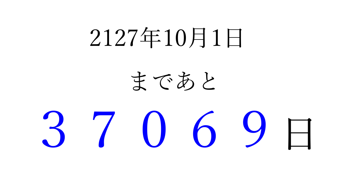 2127年10月1日(水)まで あと 99999 日です 追加すると、トップページからすぐ選べるようになります ※2026/04/04現在の結果です。 最新の状態に更新する ↓シェアして、タイムライン上にカウントダウンを表示しよう!↓ 📤 この結果を共有する Tweet シェア Threads Bluesky 別の日付でカウントダウン 2127年10月のカレンダー このページをブックマークに追加すると、いつでもカウントダウンを確認できます。 (PC: Ctrl+D / Mac: ⌘+D) hitome-notes.comでは以下のページも運営しています。 指定日と期間から日付を計算 | ガチャ確率計算・シミュレーション | プライバシー・ポリシー 運営者:Avocado