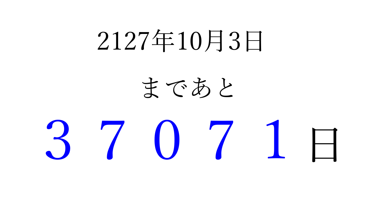 2127年10月3日(金)まで あと 99999 日です 追加すると、トップページからすぐ選べるようになります ※2026/04/04現在の結果です。 最新の状態に更新する ↓シェアして、タイムライン上にカウントダウンを表示しよう!↓ 📤 この結果を共有する Tweet シェア Threads Bluesky 別の日付でカウントダウン 2127年10月のカレンダー このページをブックマークに追加すると、いつでもカウントダウンを確認できます。 (PC: Ctrl+D / Mac: ⌘+D) hitome-notes.comでは以下のページも運営しています。 指定日と期間から日付を計算 | ガチャ確率計算・シミュレーション | プライバシー・ポリシー 運営者:Avocado