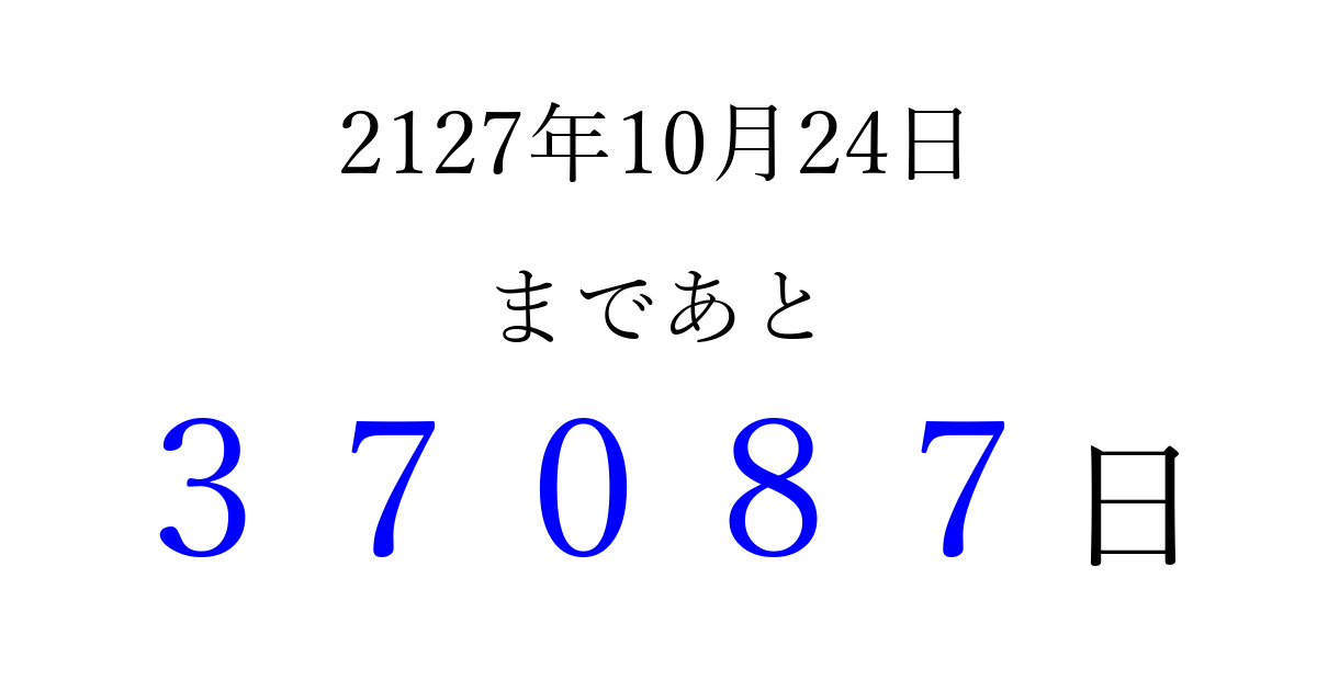 2127年10月24日(金)まで あと 99999 日です 追加すると、トップページからすぐ選べるようになります ※2026/04/09現在の結果です。 最新の状態に更新する ↓シェアして、タイムライン上にカウントダウンを表示しよう!↓ 📤 この結果を共有する Tweet シェア Threads Bluesky 別の日付でカウントダウン 2127年10月のカレンダー このページをブックマークに追加すると、いつでもカウントダウンを確認できます。 (PC: Ctrl+D / Mac: ⌘+D) hitome-notes.comでは以下のページも運営しています。 指定日と期間から日付を計算 | ガチャ確率計算・シミュレーション | プライバシー・ポリシー 運営者:Avocado