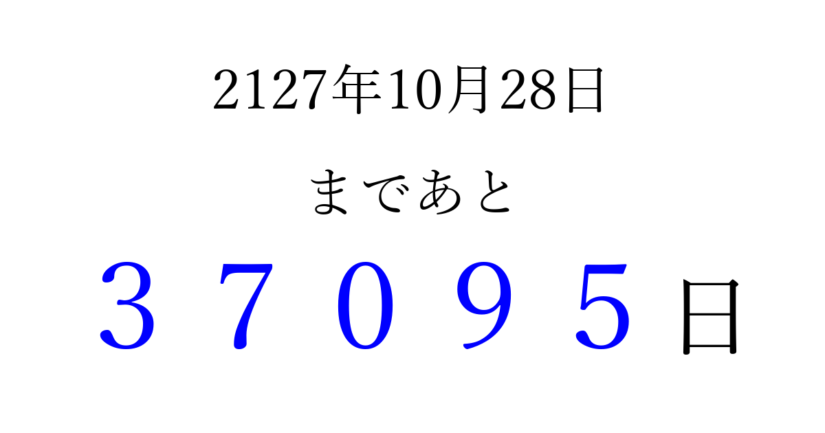 2127年10月28日(火)まで あと 99999 日です 追加すると、トップページからすぐ選べるようになります ※2026/04/05現在の結果です。 最新の状態に更新する ↓シェアして、タイムライン上にカウントダウンを表示しよう!↓ 📤 この結果を共有する Tweet シェア Threads Bluesky 別の日付でカウントダウン 2127年10月のカレンダー このページをブックマークに追加すると、いつでもカウントダウンを確認できます。 (PC: Ctrl+D / Mac: ⌘+D) hitome-notes.comでは以下のページも運営しています。 指定日と期間から日付を計算 | ガチャ確率計算・シミュレーション | プライバシー・ポリシー 運営者:Avocado