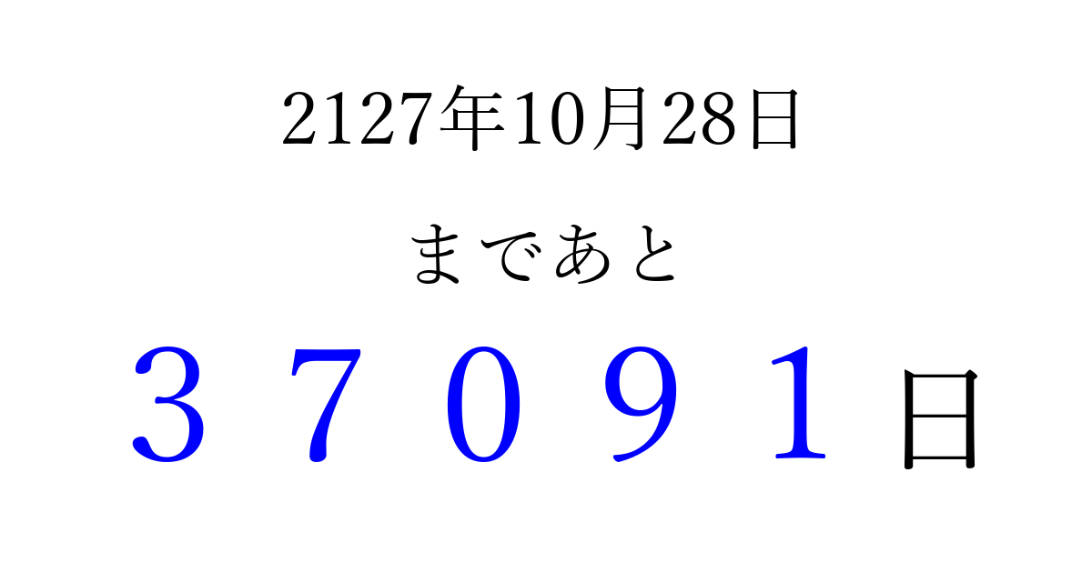 2127年10月28日(火)まで あと 99999 日です 追加すると、トップページからすぐ選べるようになります ※2026/04/09現在の結果です。 最新の状態に更新する ↓シェアして、タイムライン上にカウントダウンを表示しよう!↓ 📤 この結果を共有する Tweet シェア Threads Bluesky 別の日付でカウントダウン 2127年10月のカレンダー このページをブックマークに追加すると、いつでもカウントダウンを確認できます。 (PC: Ctrl+D / Mac: ⌘+D) hitome-notes.comでは以下のページも運営しています。 指定日と期間から日付を計算 | ガチャ確率計算・シミュレーション | プライバシー・ポリシー 運営者:Avocado