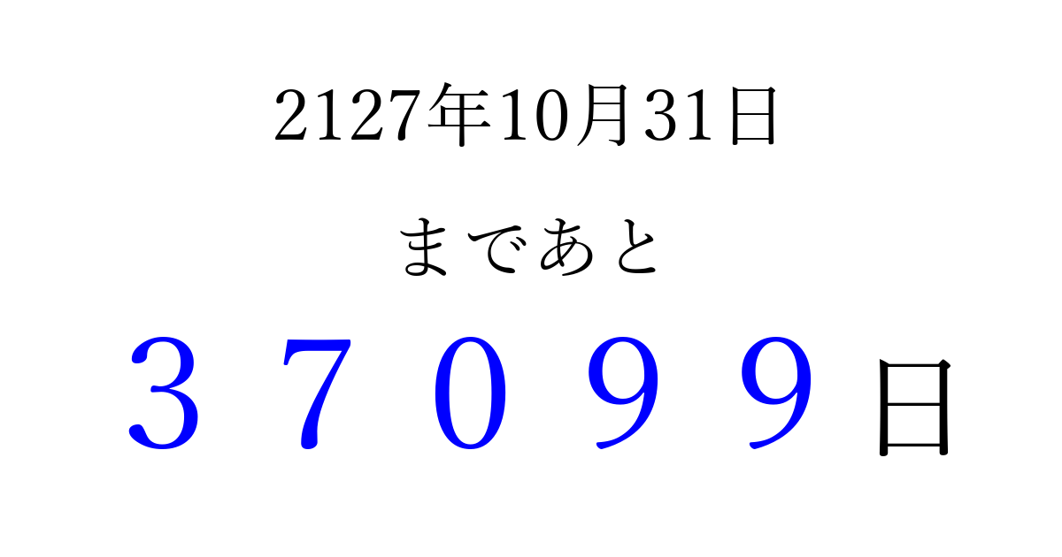 2127年10月31日(金)まで あと 99999 日です 追加すると、トップページからすぐ選べるようになります ※2026/04/04現在の結果です。 最新の状態に更新する ↓シェアして、タイムライン上にカウントダウンを表示しよう!↓ 📤 この結果を共有する Tweet シェア Threads Bluesky 別の日付でカウントダウン 2127年10月のカレンダー このページをブックマークに追加すると、いつでもカウントダウンを確認できます。 (PC: Ctrl+D / Mac: ⌘+D) hitome-notes.comでは以下のページも運営しています。 指定日と期間から日付を計算 | ガチャ確率計算・シミュレーション | プライバシー・ポリシー 運営者:Avocado