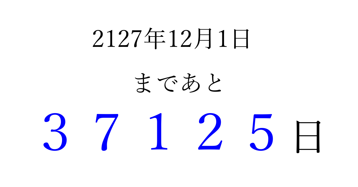 2127年12月1日(月)まで あと 99999 日です 追加すると、トップページからすぐ選べるようになります ※2026/04/09現在の結果です。 最新の状態に更新する ↓シェアして、タイムライン上にカウントダウンを表示しよう!↓ 📤 この結果を共有する Tweet シェア Threads Bluesky 別の日付でカウントダウン 2127年12月のカレンダー このページをブックマークに追加すると、いつでもカウントダウンを確認できます。 (PC: Ctrl+D / Mac: ⌘+D) hitome-notes.comでは以下のページも運営しています。 指定日と期間から日付を計算 | ガチャ確率計算・シミュレーション | プライバシー・ポリシー 運営者:Avocado